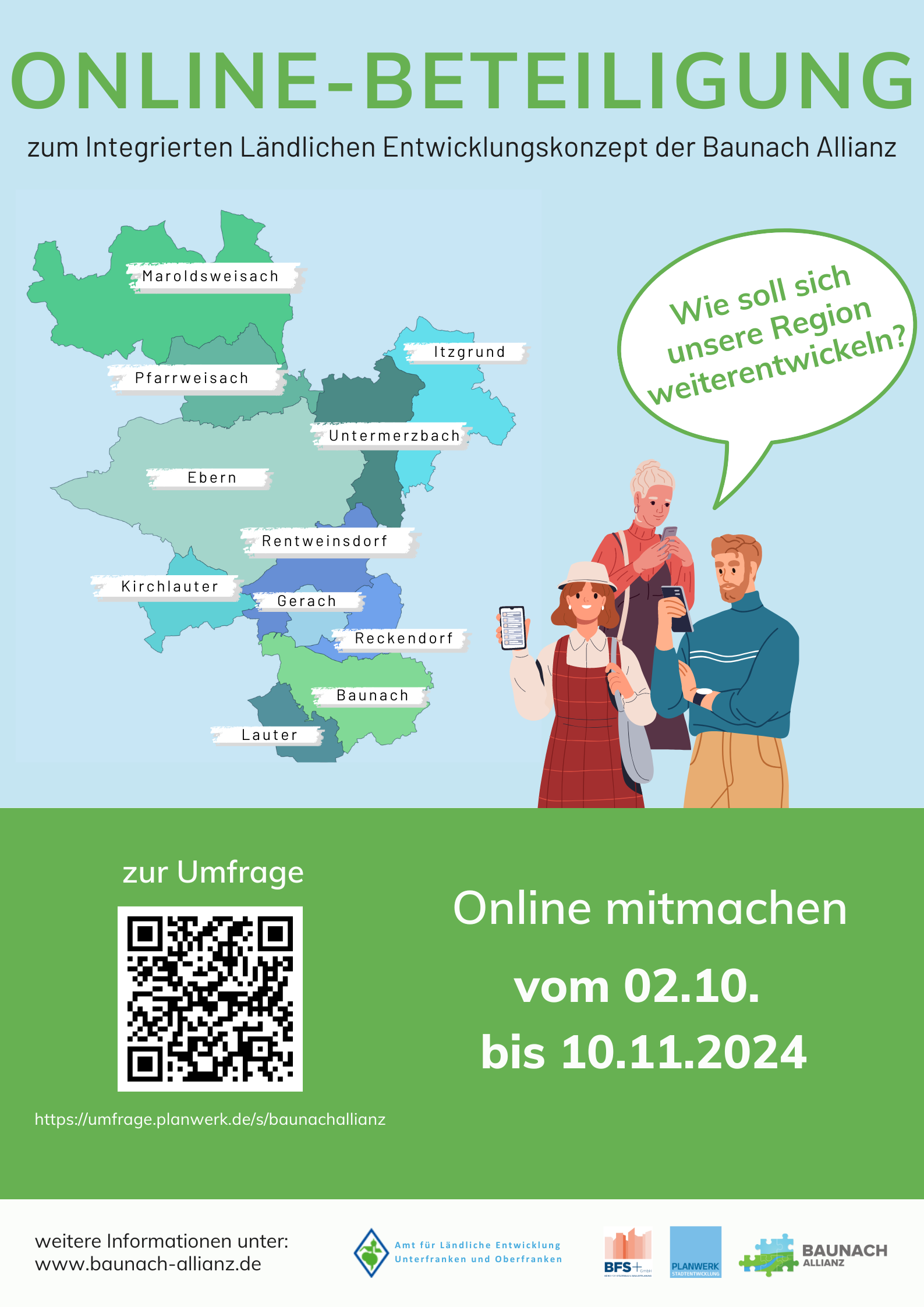 Seit 2018 sind die elf Kommunen Baunach, Ebern, Maroldsweisach, Rentweinsdorf, Reckendorf, Itzgrund, Untermerzbach, Lauter, Kirchlauter, Pfarrweisach und Gerach miteinander vernetzt. Unter dem Motto „Gemeinsam – Nachhaltig – Vielfältig“ ist in den letzten Jahren über diesen Zusammenschluss im Bereich der Ländlichen Entwicklung viel passiert. Das sog. Integrierte Ländliche Entwicklungskonzept (ILEK) aus dem Jahr 2018 bildet dabei die Grundlage der bisherigen Zusammenarbeit der Baunach Allianz. Um die Herausforderungen für den ländlichen Raum auch weiterhin anzugehen und die Zukunft der Region gemeinsam zu gestalten, ist es an der Zeit die bisherige Arbeit der Baunach Allianz zu reflektieren, neue Weichen zu stellen und im Rahmen der Fortschreibung des integrierten Ländlichen Entwicklungskonzeptes einen aktuellen Fahrplan festzulegen. Die ILEK-Fortschreibung bildet die Grundlage für die weitere Zusammenarbeit und erfolgt unter Beteiligung der Bürgerschaft sowie lokaler Akteure.