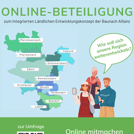 Die Beteiligung der Bürgerschaft an der Erstellung der Zukunftsstrategie für die Baunach Allianz ist ein zentraler Erfolgsfaktor. Denn Sie als Einwohner:in bzw. Akteur:in der ILE kennen Ihre Region am besten. Wir bitten Sie daher an der Online-Befragung, welche vom 02. Oktober bis 10. November 2024 aktiv ist, teilzunehmen. Hier haben Sie die Möglichkeit, uns Ihre Ideen und Wünsche für die Region u.a. in Themenfeldern wie Mobilität, Nahversorgung, soziales Miteinander oder Freizeit mitzuteilen und sich damit aktiv in den Prozess einzubringen.